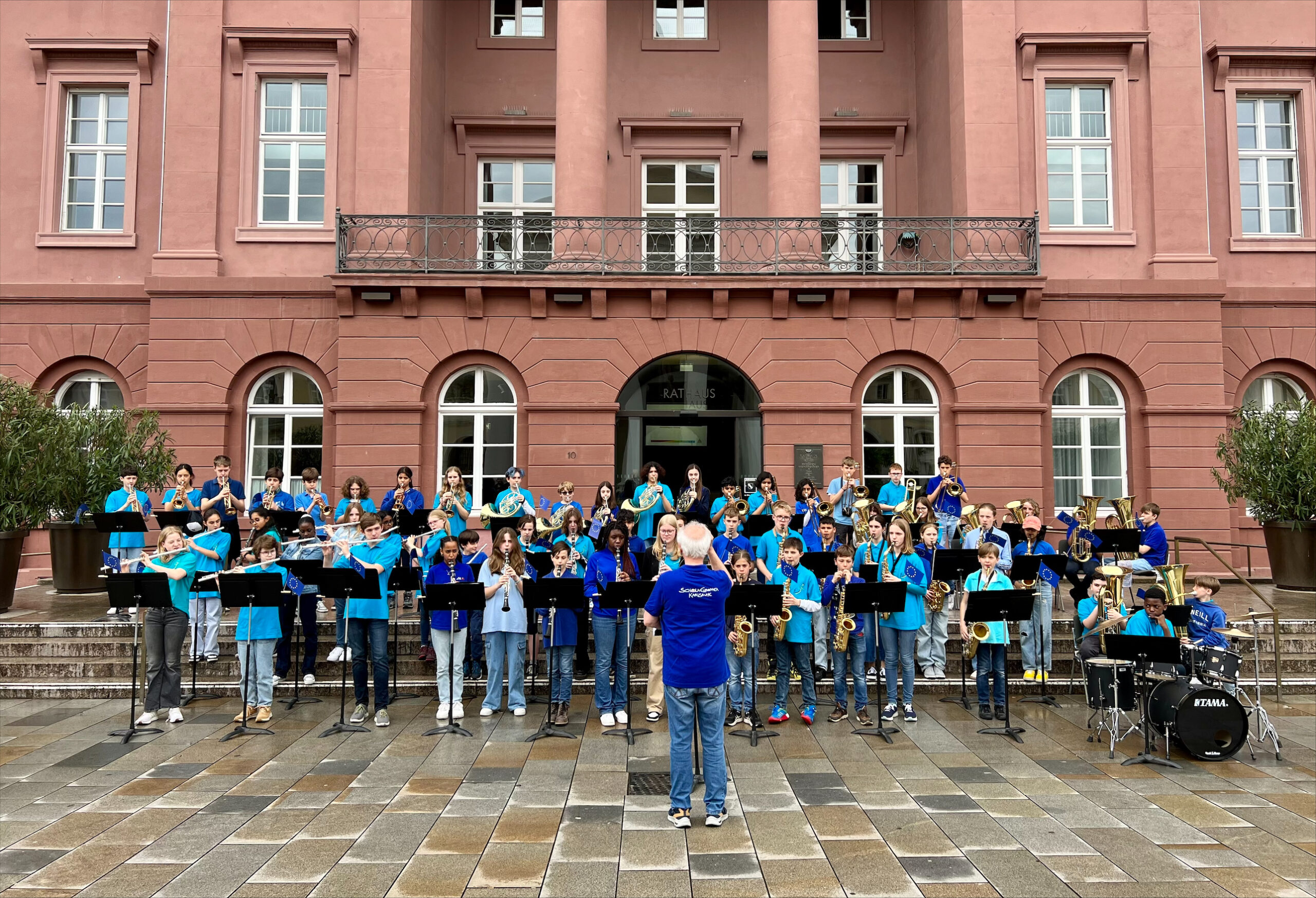 Nachdem die Bläserklasse der Europäischen Schule zuerst im frühlingshaften Innenhof der Oberschule die Europahymne spielte, machten sie sich auf dem Weg zum Rathaus: Auf Einladung des Oberbürgermeisters Dr. Frank Mentrup musizierte die Bläserklasse unter Leitung von Klaus Braun auf dem Marktplatz.