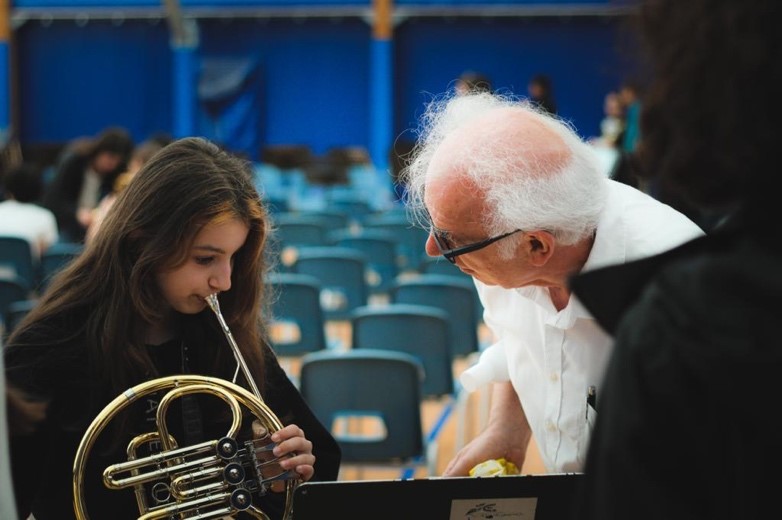 - Hier hilft Herr Braun einer Schülerin das Horn zu spielen