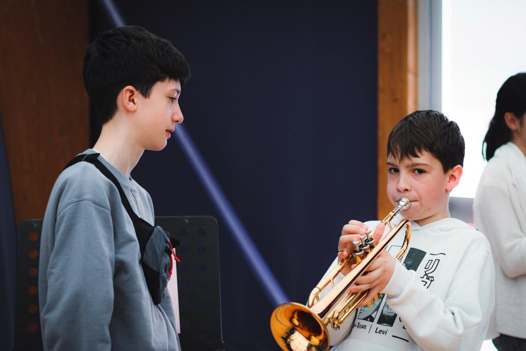 - Matteo hilft einem S1 Schüler das Trompeten spielen