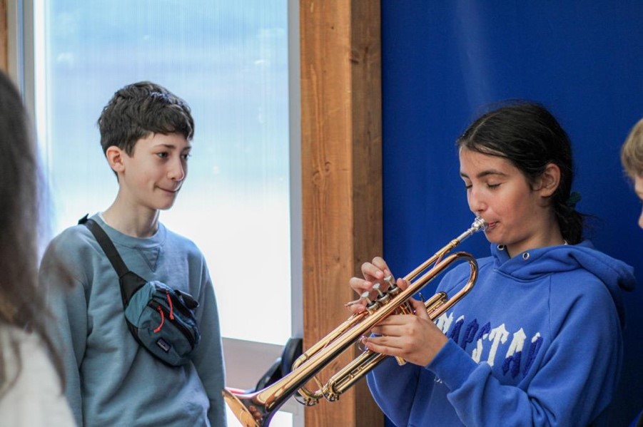 - Beim Workshop hat Matteo einen Schüler aus der S1 geholfen die Trompete zu spielen