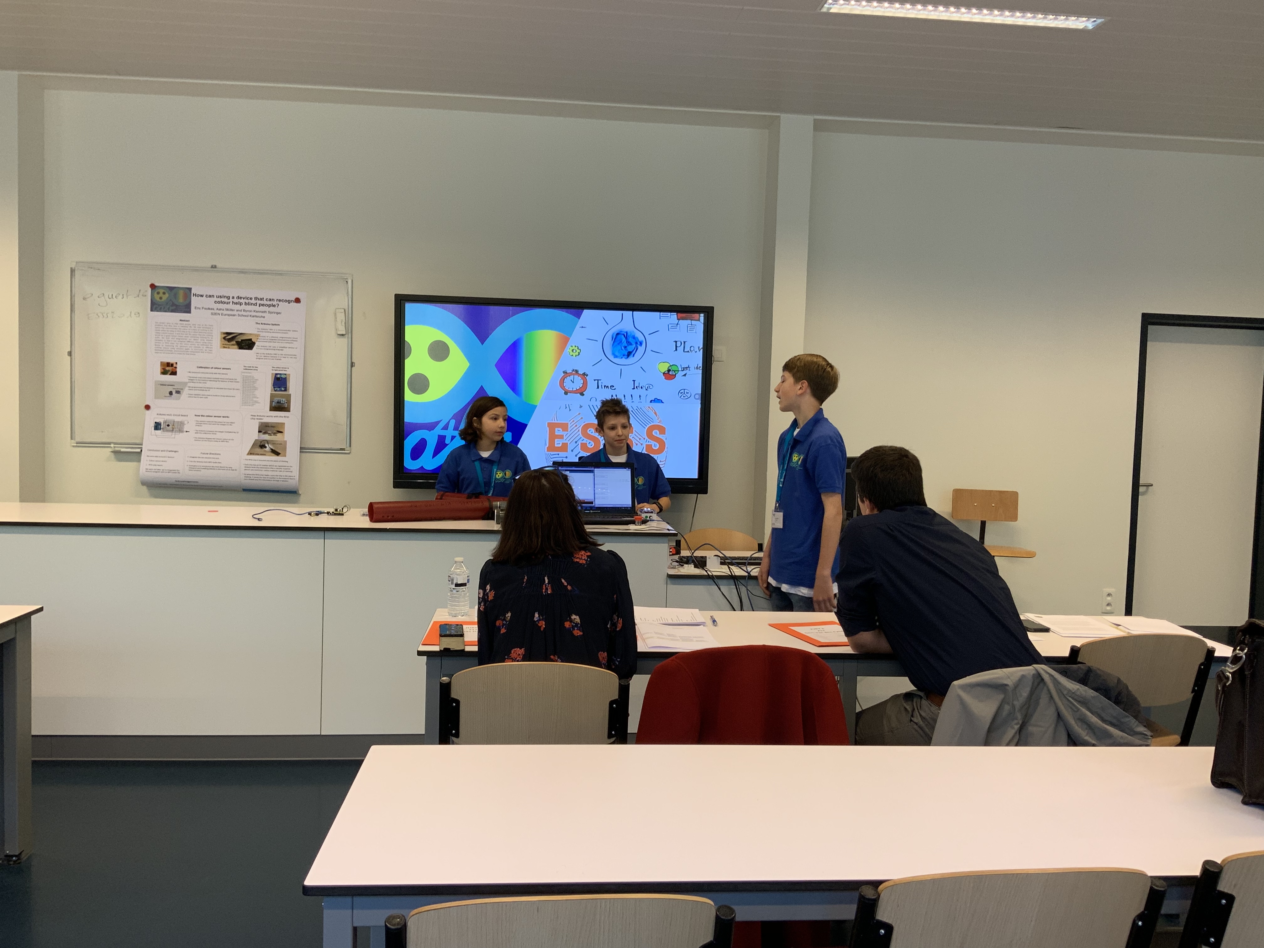Vier Schülerinnen und Schüler aus der zweiten Klasse der Oberschule an der Europäischen Schule Karlsruhe haben in zwei Arbeitsgruppen dieses Jahr erfolgreich eigene Forschungsergebnisse während des European School Science Symposiums (ESSS) Standort der Europäischen Schule in Mol (Belgien) vorgestellt. Dhruv Reddi präsentierte seine Untersuchung: „Managing the moisture content in indoor plants from a central control“ und zeigte dabei, wie eine automatisierte Bewässerung von Zimmerpflanzen effizient vorgenommen werden kann. Mit dem Projekt zur Entwicklung einer Farbansage für Blinde Menschen zur Erkennung der Farbe an Kleidungsstücken: „How can blind people be helped by using a device that can recognize colors“ erreichten Asha Müller, Byron Springer sowie Eric Foulkes in der Wertung der 37 Junior-Projekte den 4. Platz.