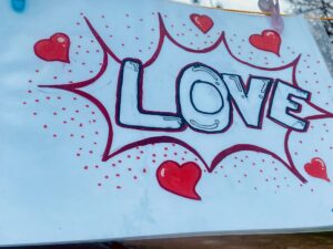 Les P2 et P1 ont passé la matinée à dessiner sur le sol d’énormes bulles dans lesquelles ils se sont pris en photo.