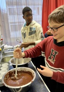 In vier Gruppen wurden lauter Leckereien hergestellt: Kürbissuppe mit frischem Baguette und Knoblauchbutter, Apfeltaschen, Muffins und ein Kirschkuchen.