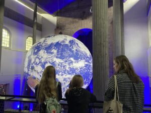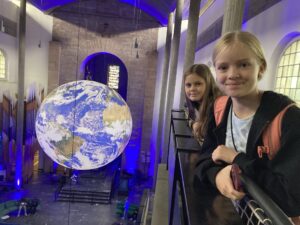 Frau Lang war mit ihrem Kunstkurs S1 der Oberschule und Anouska Doms als Begleitung am Montag den 23.09.2024 in der Ausstellung GAIA in der Stadtkirche am Marktplatz Karlsruhe. Dort konnten wir den riesigen mit 7 Meter Durchmesser großen Globus betrachten und eine Führung erhalten. Dadurch kamen passend zu unserem aktuellen Thema « Weltraum und Farben » im Kunstunterricht viele Fragen zu Nachhaltigkeit, Zusammenhalt und der Zukunft der Erde auf.