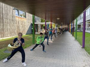 In bester Laune und Spielfreude hat die Bläserklasse S2 die Open Air Orchesterproben auf dem Naturareal der Europäischen Schule aufgenommen. Nach nervenzehrendem Online-Instrumentalunterricht macht das Zusammenspiel unter Leitung von Musiklehrer Klaus Braun in den Tutti-Proben unter freiem Himmel so richtig Spaß. Durch das Waldesecho weht bisweilen ein fulminanter Sound über das Schulgelände. Auftritte beim Burundi Run und Weihnachtskonzert der ESK verlangen nun fleißiges Üben von den jungen Musikanten und Musikantinnen, die auf der Kletterpyramide und der Tonleiter hochhinauf wollen – und eine Bläserklassenkonzertreise nach Den Haag erscheint auch schon am Horizont des neuen Schuljahres