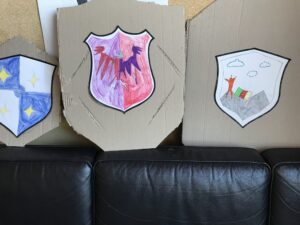 Grâce à cette documentation, nous avons ensuite mené plusieurs activités artistiques inspirées de l’époque médiévale. Nous avons d’abord réalisé nos propres blasons, en nous appuyant sur les codes héraldiques. Chaque élève a pu inventer un symbole qui le représente, tout en respectant les règles de composition médiévales.