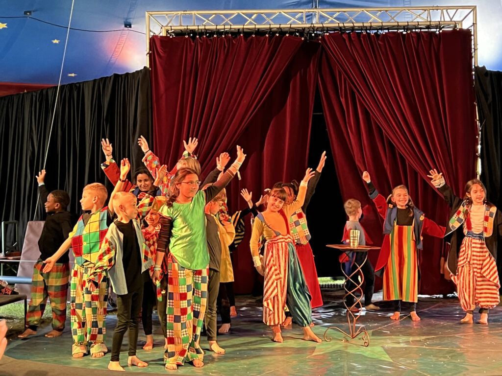 Mit großer Freude kamen die Kinder am Montagmorgen zur Schule. Die Zirkuswoche begann mit einer gemeinsamen Einstimmung im Zirkuszelt – mit einer kurzen Zirkus-Show der Lehrkräfte.
